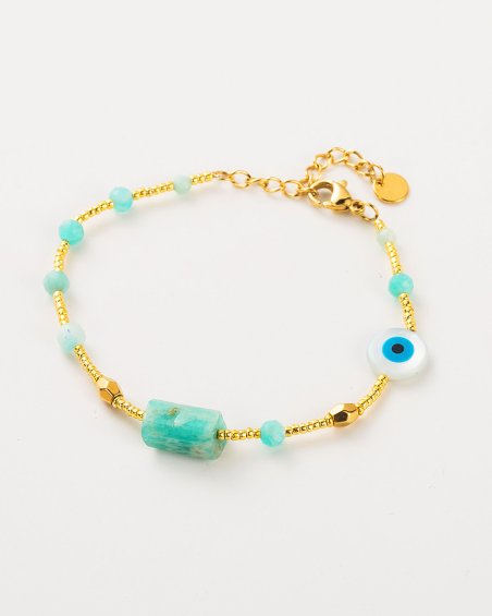 Ce bracelet fin est composé de perles dorées, d'une pierre d'amazonite et d'un symbole d’œil. Ce bijou est ajustable grâce à une petite chainette de réglage de 3cm.
