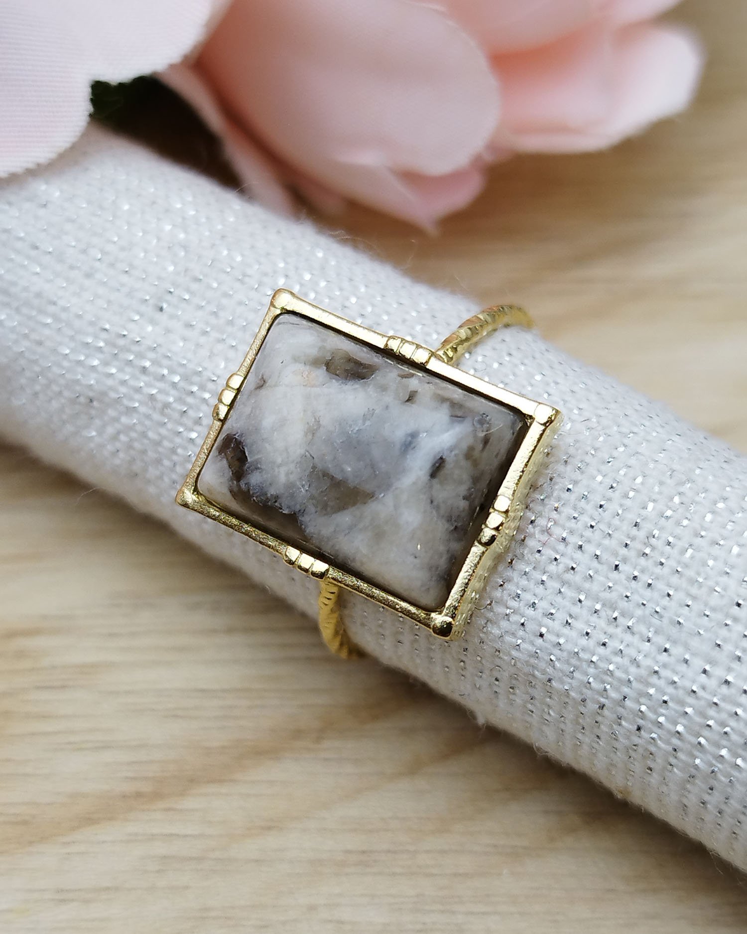 Bague en acier inoxydable doré sertie d'une pierre grise