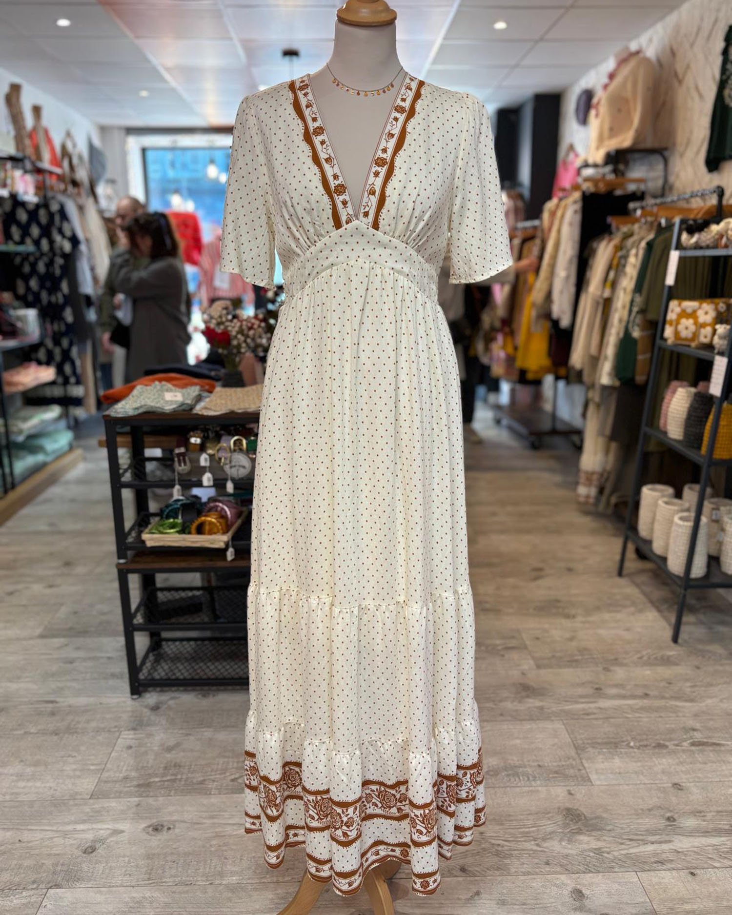 Robe longue écrue à imprimé bohème