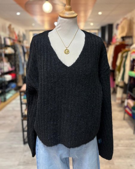 Pull côtelé noir à col en V