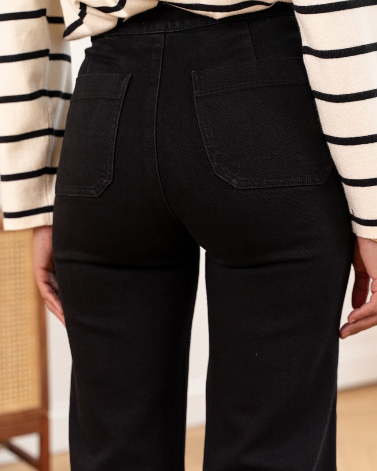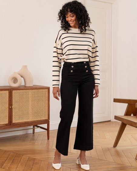 Jeans noir évasé style marin à taille haute